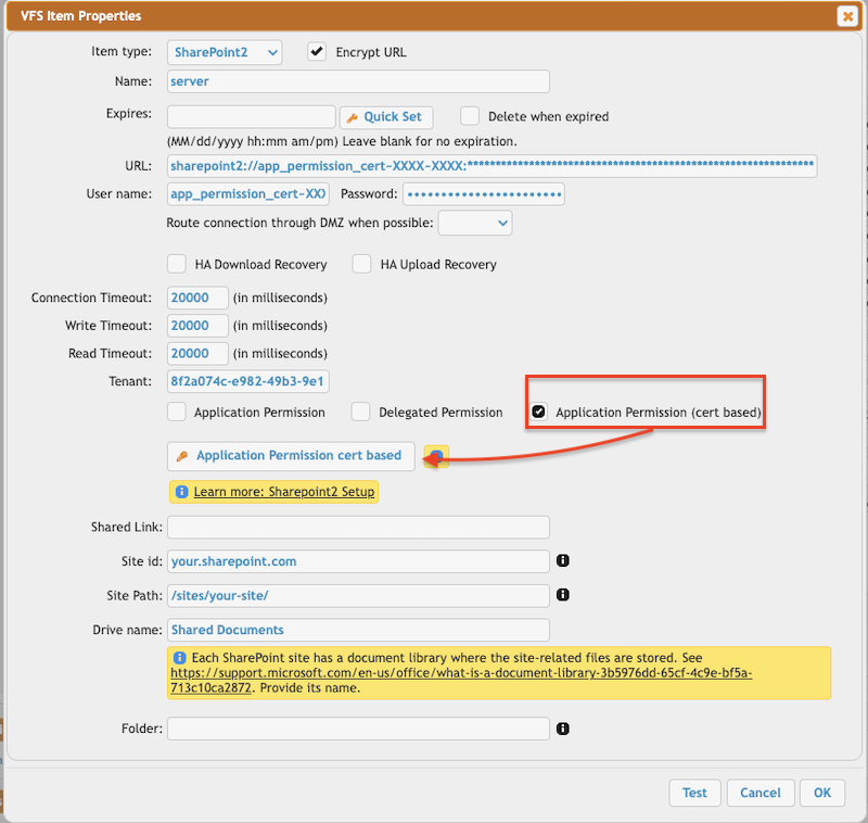 1.1 SharePoint2 VFS item configuration: Application Permission - Certificate Based: